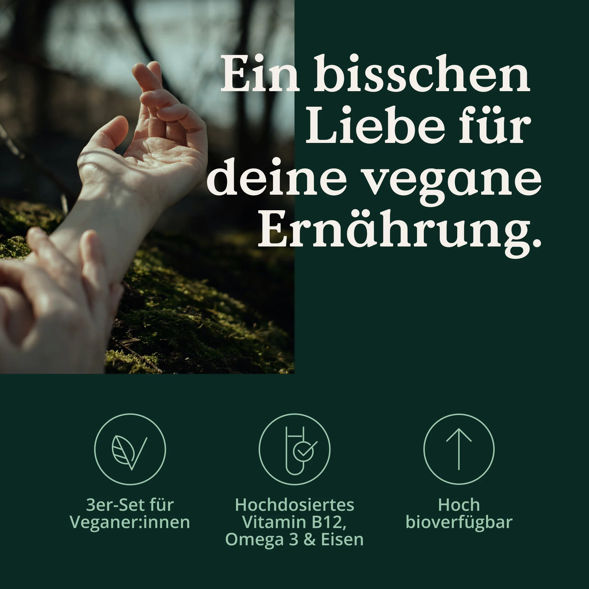 In unserem Rundum-Vegan-Set stecken mit Vitamin B12, Omega 3 und Eisen gleich 3 Nährstoffe, die laut DGE bei pflanzlicher Ernährung schnell mal zu kurz kommen können. Darum bekommst du sie bei uns alle in einem Set und 15 % günstiger als die Einzelprodukte. Außerdem hochdosiert, hoch bioverfügbar und selbstverständlich komplett vegan. Einfach pflanztastisch!