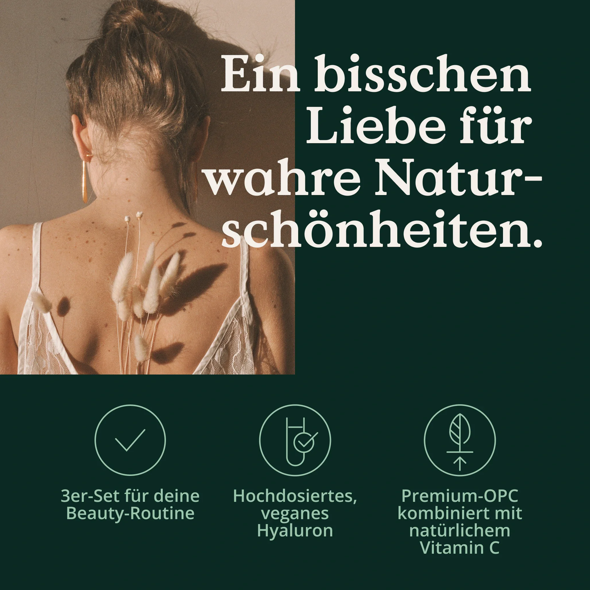 Wahre Schönheit kommt von innen – ist doch klar. Und damit du nun von innen nach außen strahlen kannst, ist es wichtig, deinen Körper mit den richtigen Nährstoffen zu versorgen.¹ ² Für deine neue Beauty-Routine gibt's bei uns daher ein Set bestehend aus den Top-Nährstoffen für dein wunderschönes Ich: OPC Traubenkernextrakt, Bio Gerstengras Kapseln und veganes Hyaluron. Auf diese 3 Naturschätze darfst du dich freuen: